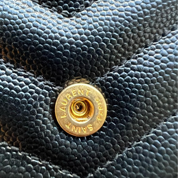 Authentic Yves Saint Laurent matelasse long envelope flap wallet converted to crossbody WOC bag. Black Grain De Poudre caviar leather with gold hardware.